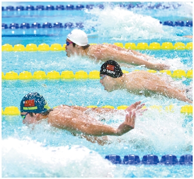 运动员在十五运会游泳项目男子100米蝶泳决赛中。